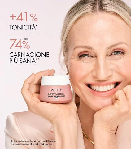 La nuova crema di Vichy Neovadiol Rose Platinium contiene Cera d'api nutritiva + calcio fortificante per una pelle più forte e meno sottile.